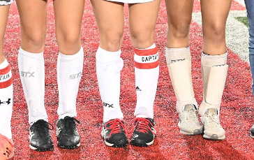 En esta foto, el equipo de la Universidad de Mary Washington usa canilleras con unas medias de color azul para señalar que están todas en el mismo equipo.